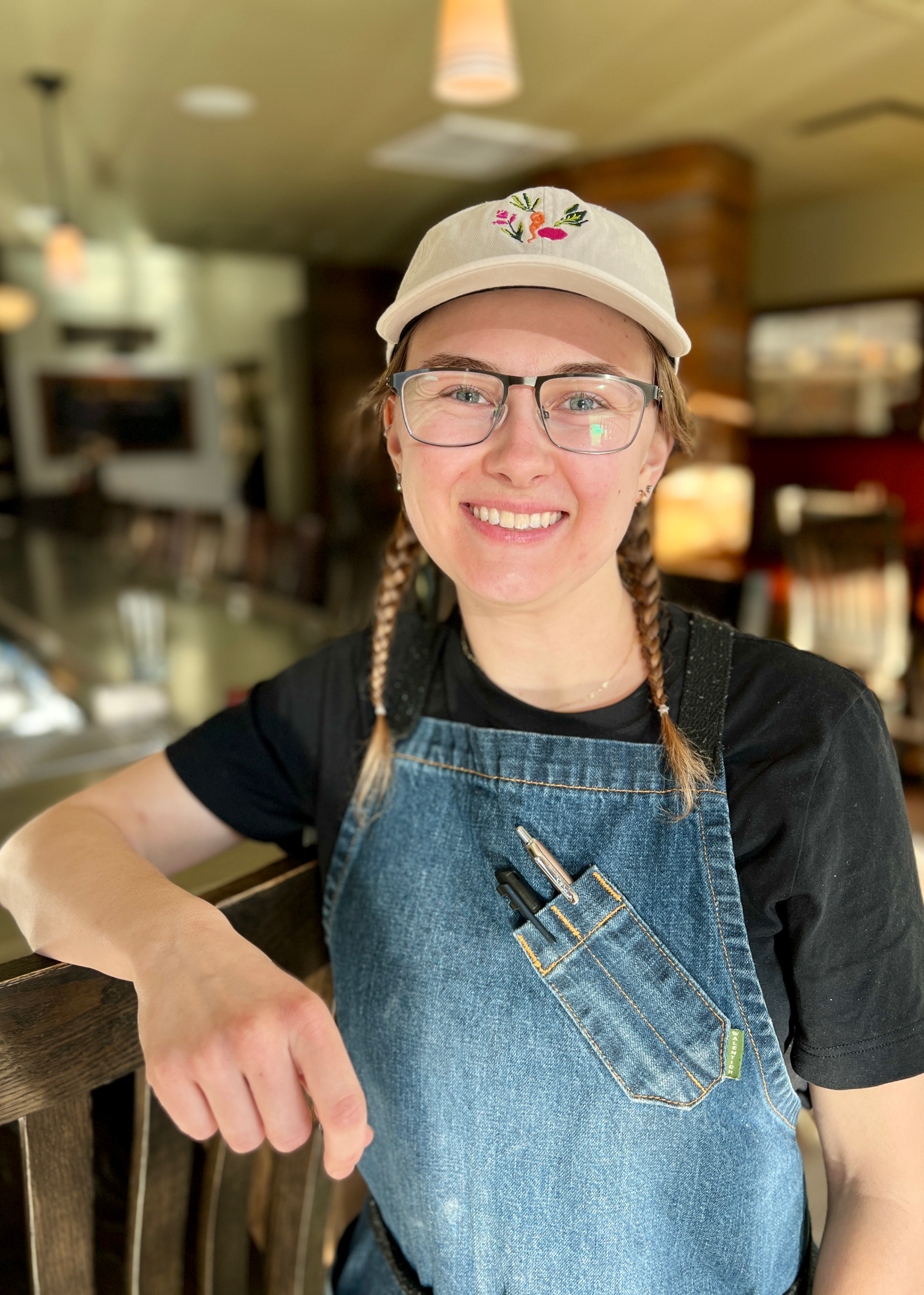 Kathy grew up in West Bend, WI, but her journey into hospitality began far from home—in sunny San Diego, CA. After graduating from UW–Madison, she moved first to Georgia and then west to San Diego, where she found herself drawn into the city’s vibrant restaurant scene. What began as a second job hosting and serving quickly became a full-time gig, eventually leading her to a role as assistant manager in a bustling community of restaurants. A move back to Madison brought Kathy to the Madison restaurant scene—thanks to a San Diego connection—where she met Evan (just friends at first!) and a year later, they began dating. As the seasons of life changed, Evan opened Cadre and Kathy was working full-time in HR for a tech company in Chicago. When the tech company dissolved, Cadre “needed a mama,” and she stepped fully into the role—proud to help grow her partner’s restaurant. For Kathy, Cadre is more than a business; it’s a chance to build her community, love her team like family, and create a space where guests feel truly cared for. She treasures Cadre’s tight-knit staff, the many regulars who bring back gifts from their travels, and the deep connections with local farmers. For Kathy, hospitality is about listening to people’s stories and sharing in the joy of a thoughtfully made meal—like silky pommes purée or the vibrant, crisp vegetable dishes of summer that can only be enjoyed at their peak.